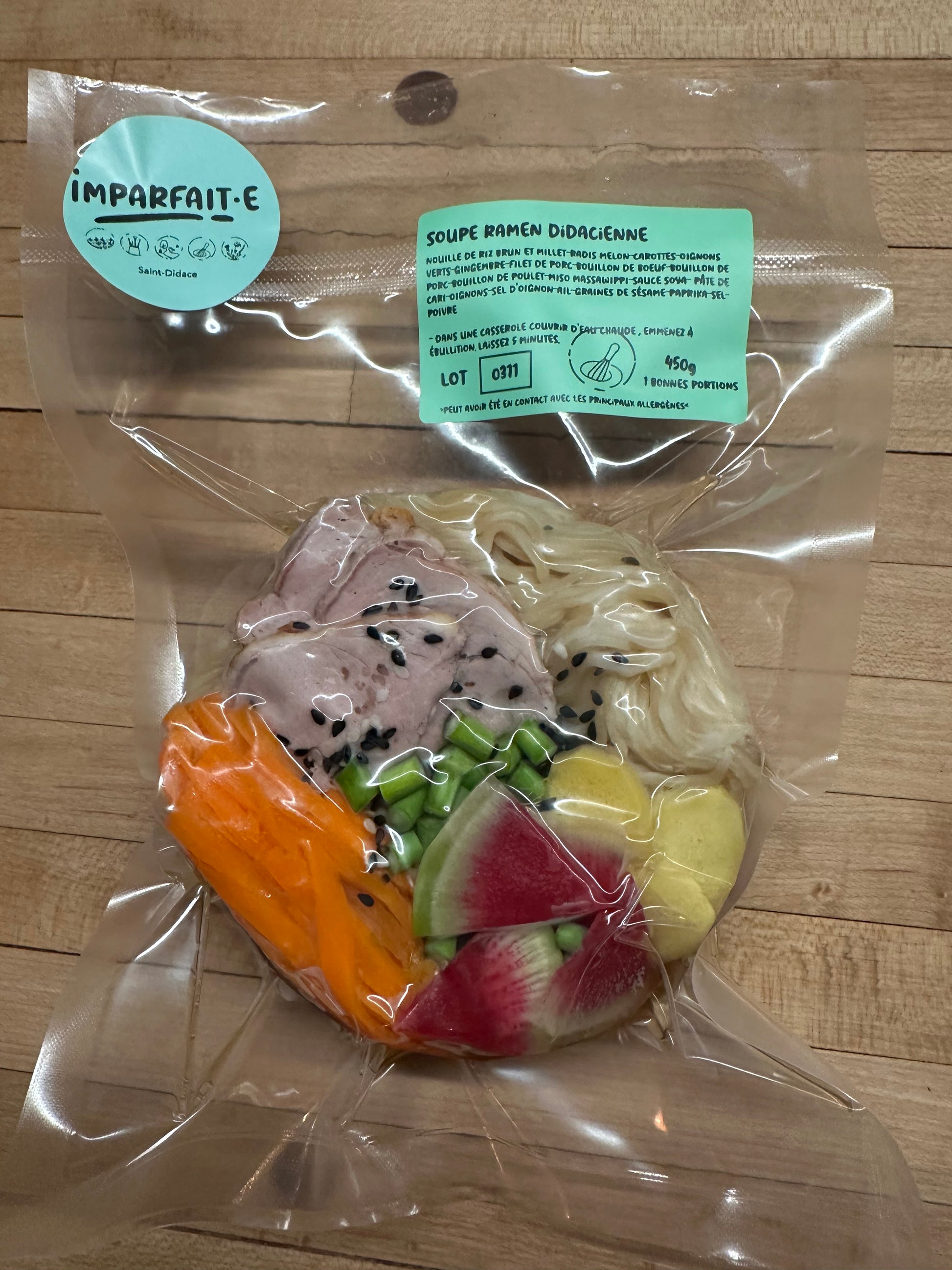 Oserez-vous? Ce n'est pas une vulgaire ramen en sachet. À base d'un délicieux bouillon maison avec du miso (Aliment massawipi), accompagné de morceaux de longe de porc de Cochon cent façons et d'appétissants légumes.